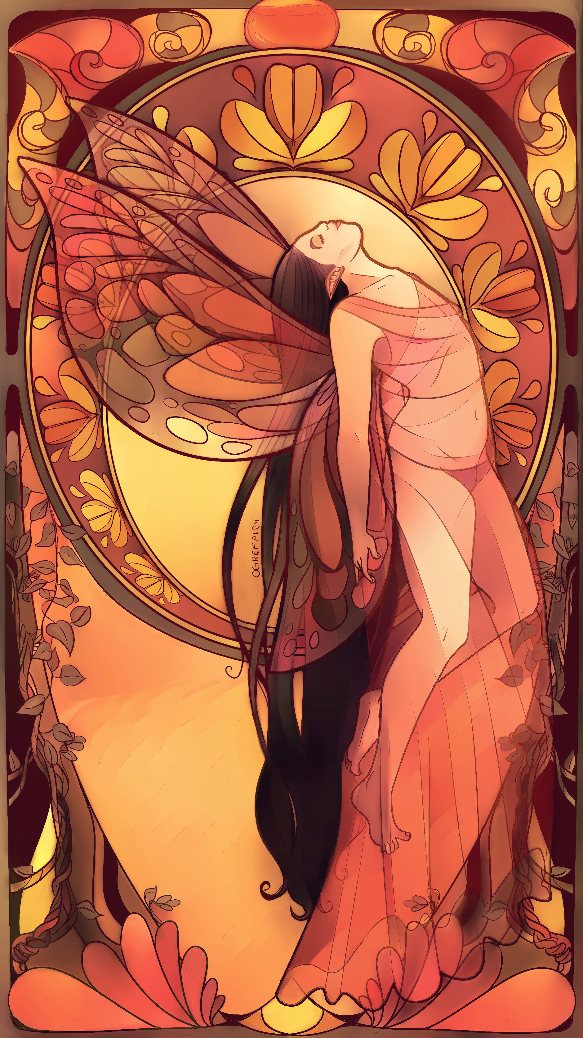 [ID: an art nouveau inspired painting featuring a fairy in fall. She is east asian and has very very long black hair. She has large, translucent wings and is wearing a sheer dress as she hovers over a yellow field. There are vines winding up the border. The image is in mostly oranges, yellows and greens.]