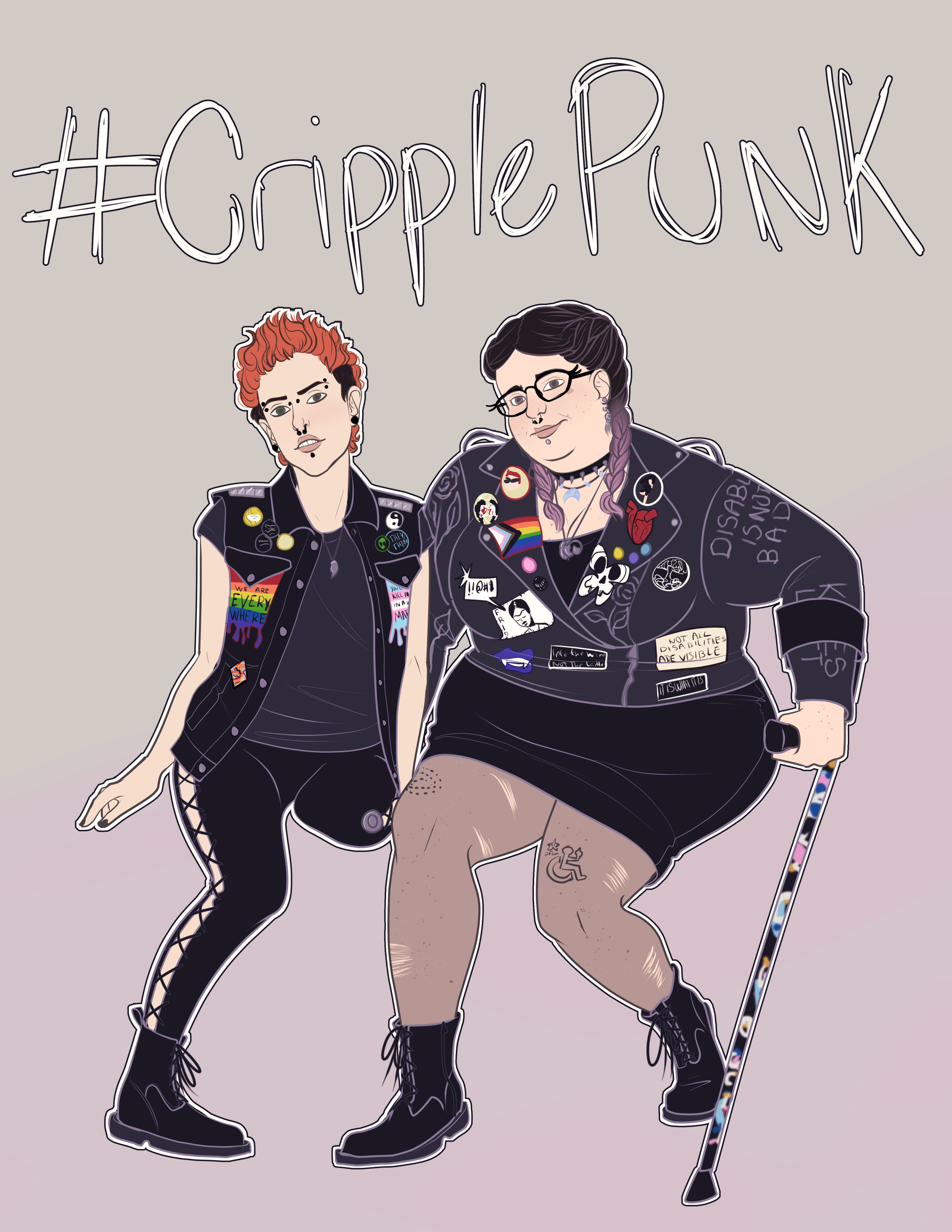 [ID: a digital drawing featuring two disabled people. The first is thin with short orange hair and many facial piercings and missing their left leg. The second is fat with longer hair that is braided and purple on the ends. they have glasses and also have some piercings. They are holding a forearm crutch at their side. Both people are white and sitting and are dressed in black with many patches, many disability or pride themed. Above them is the hashtag #CripplePunk]