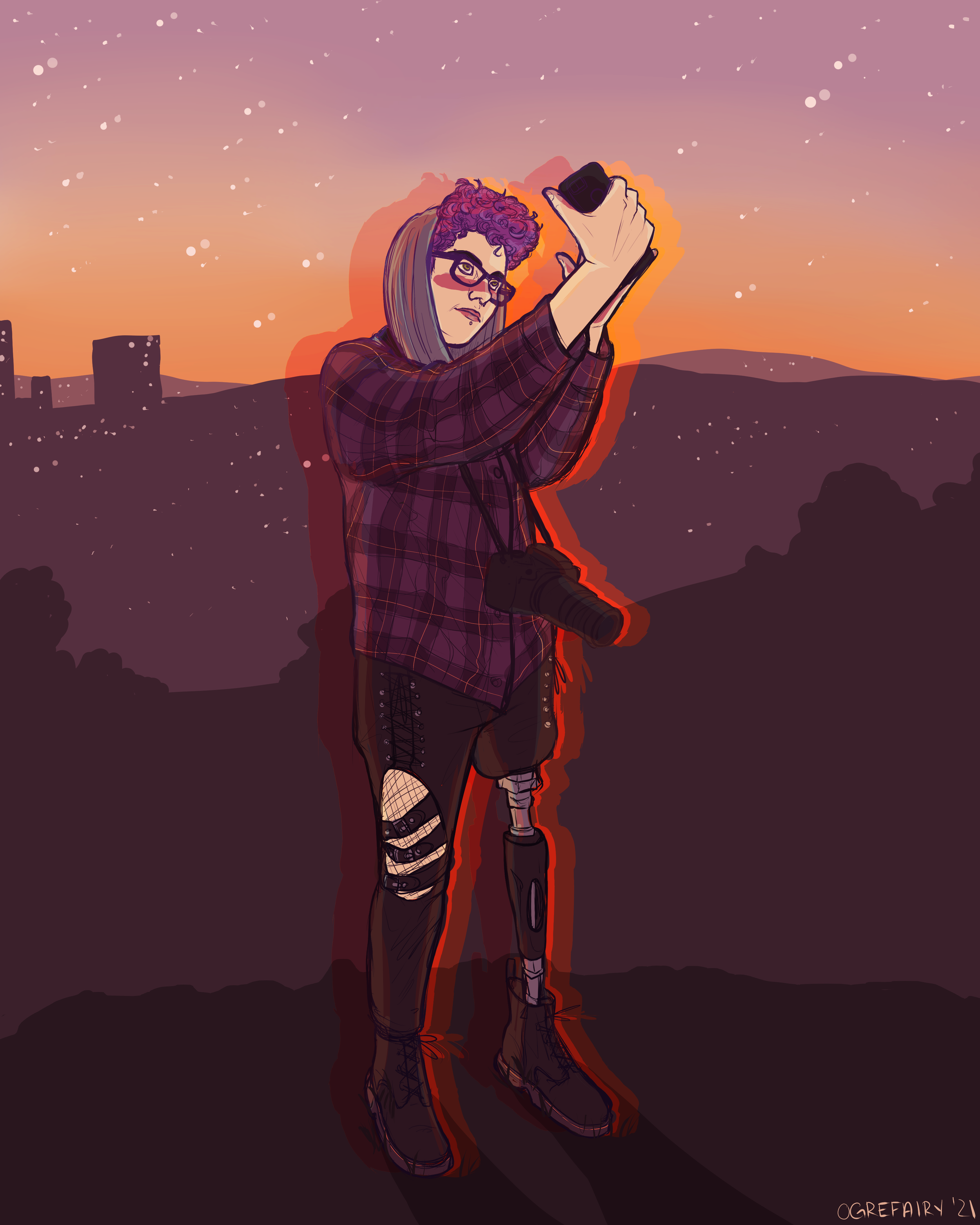 [ID: My friend Ash standing and taking a photo with a cellphone, They are looking up at the screen and looking at it intently. They also have a camera around their neck. They’re wearing a hood and a purple flannel as well as black leather punk pants with laces and holes in them that show fishnets. They have a left leg above then knee amputation and an implant prosthetic. The entire image has a dreamlike feel to it with intense colors]