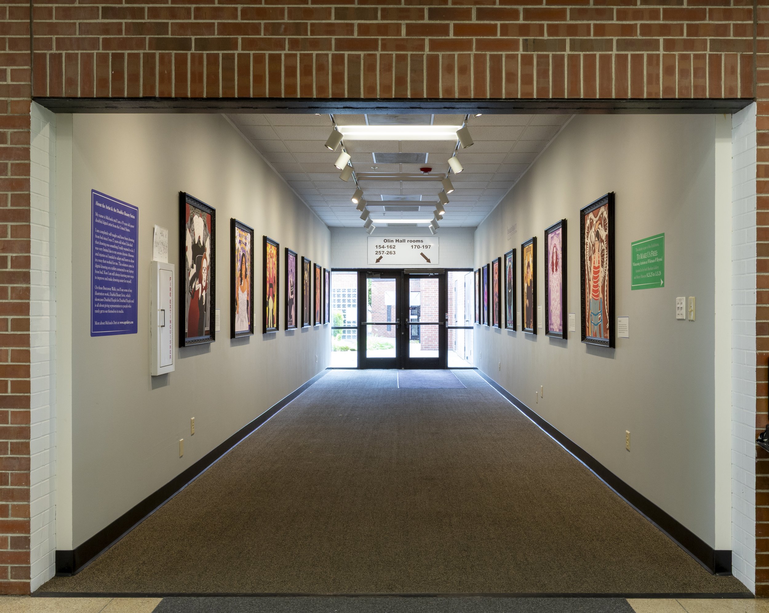 [ID: a photo of a long hallway. Both walls are lined with my disabled beauty portraits]