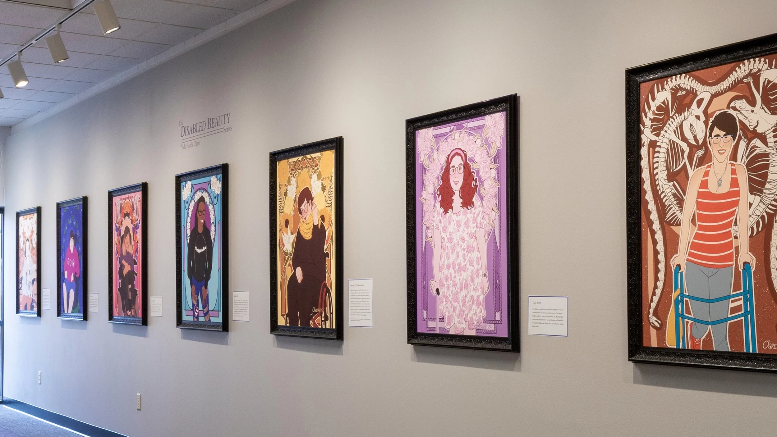 [ID: a photo of a long hallway. Both walls are lined with my disabled beauty portraits]