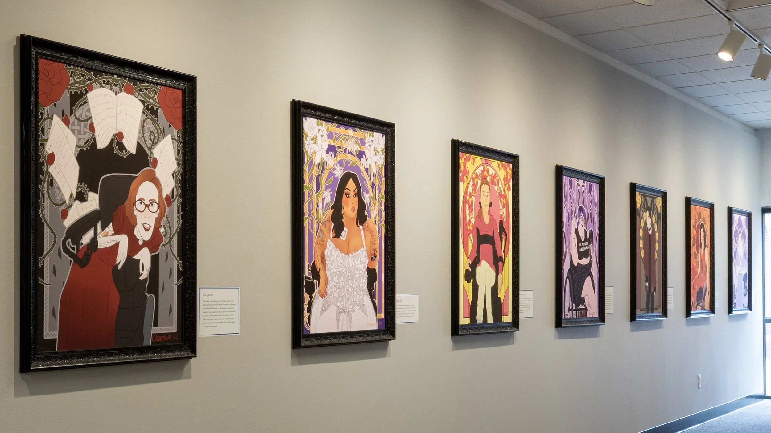 [ID: two more photos, each more focused on each wall from the hallway showing which portraits are featured. You can see to the left there is: